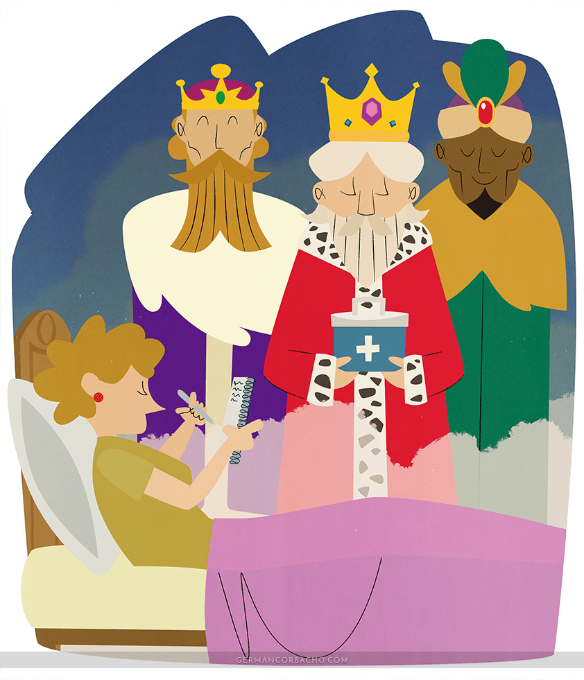 El libro reunía 15 historias reales, aportadas por 15 personas diferentes, hablando acerca de su experiencia con el trasplante de hígado, y cada hitoria va acompañada de una o dos ilustraciones. Esta ilustración cuenta la historia de una mujer que necesitaba un hígado urgentemente y literalmente se lo pidió a los Reyes Magos. Que nadie se ría, en la Noche de Reyes la trasplantaron.